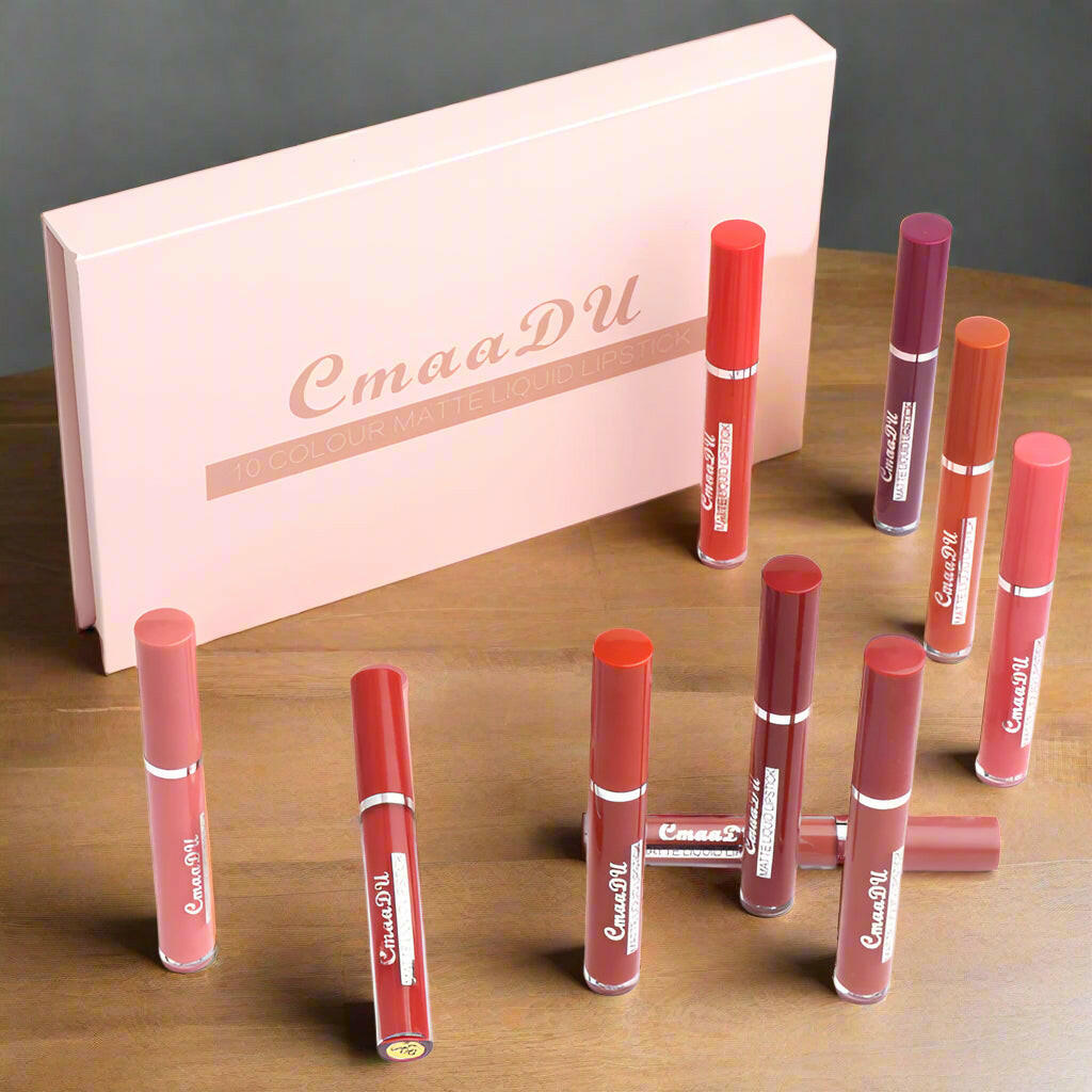 This versatile set features 10 richly pigmented matte lipsticks, each with a lightweight feel and long-lasting waterproof formula. Whether you're going for bold, neutral, or something in between, this collection has every shade to match your mood.